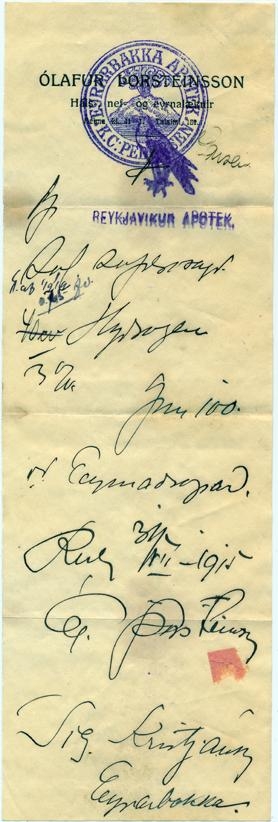Lyfseðill frá Ólafi Þorsteinssyni háls, nef og eyrnalækni. Stimpill frá Reykjavíkur apóteki. Gefin út fyrir Sigurð Kristjánsson.
