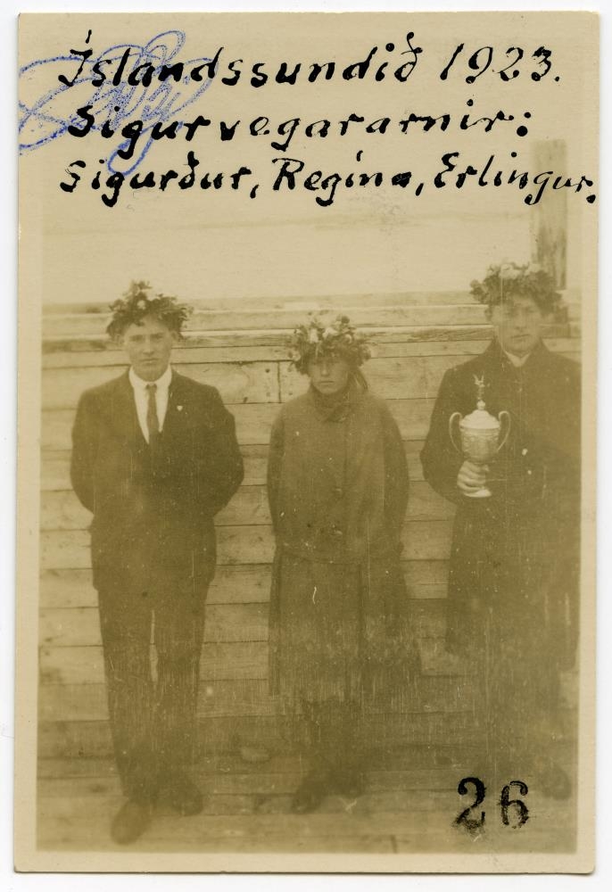 Tveir karlmenn og kona standa við timburvegg, annar karlmaðurinn heldur á bikar. Á myndina er skrifað: Íslandssundið 1923. Sigurvegararnir: Sigurður, Regína, Erlingur.