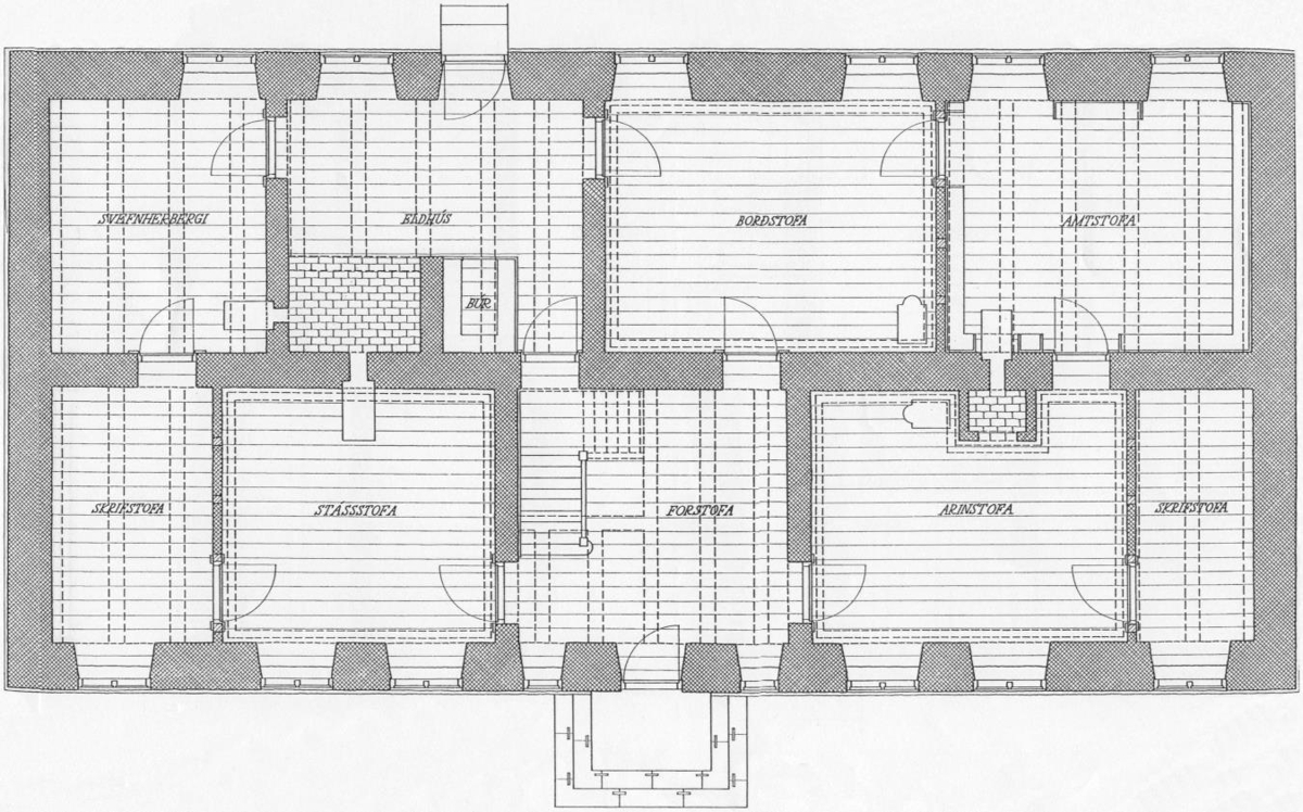 Upphafleg herbergjaskipan Bessastaðastofu. Tilheyrir svæði U1-U5 (A-E).