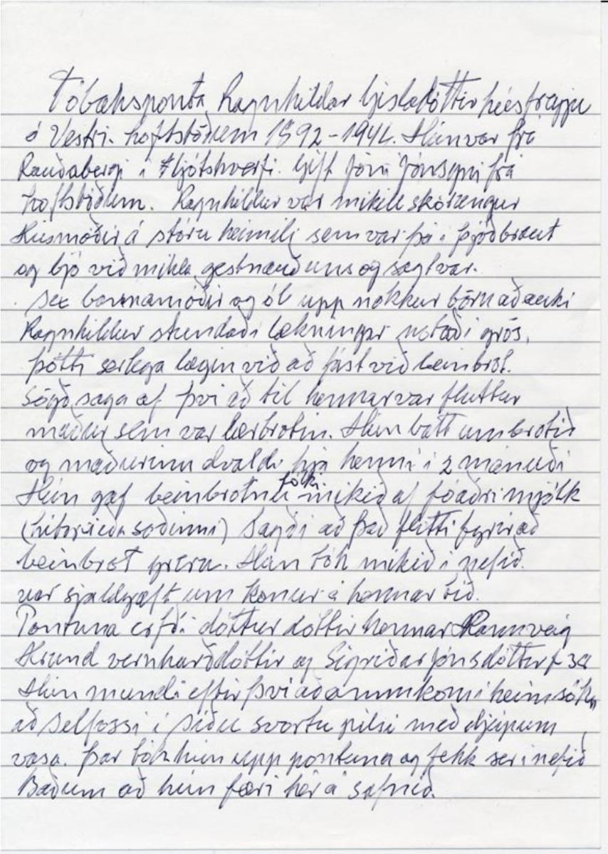Eftirfarandi upplýsingar fylgdu gripnum frá gefanda: "Tóbaksponta Ragnhildar Gísladóttur húsfreyju á Vestri-Loftsstöðum 1892-1946. Hún var frá Rauðabergi í Fljótshverfi. Gift Jóni Jónssyni frá Loftsstöðum. Ragnhildur var mikill skörungur. Húsmóðir á stóru heimili sem var þá í þjóðbraut og bjó við mikla gestnauð eins og hægt var. Sex barna móðir og ól upp nokkur börn að auki. Ragnhildur stundaði lækningar, notaði grös. Þótti sérlega lagin við að fást við beinbrot. Sögð var saga af því að til hennar var fluttur maður sem var lærbrotinn. Hún batt um brotið og maðurinn dvaldi hjá henni í 2 mánuði. Hún gaf breinbrotnu fólki mikið af flóaðri mjólk (hitaðri eða soðinni). Sagði að það flýtti fyrir að beinbrot greru. Hún tók mikið í nefið. Var sjaldgæft um konur í hennar tíð. Pontuna erfði dótturdóttir hennar Rannveig Hrund Vernharðsdóttir og Sigríðar Jónsdóttur f. 1938. Hún mundi eftir því að amma kom í heimsókn að Selfossi í síðu svörtu pilsi með djúpum vasa. Þar tók hún upp pontuna og fékk sér í nefið. Hún bað um að pontan færi á safnið."
