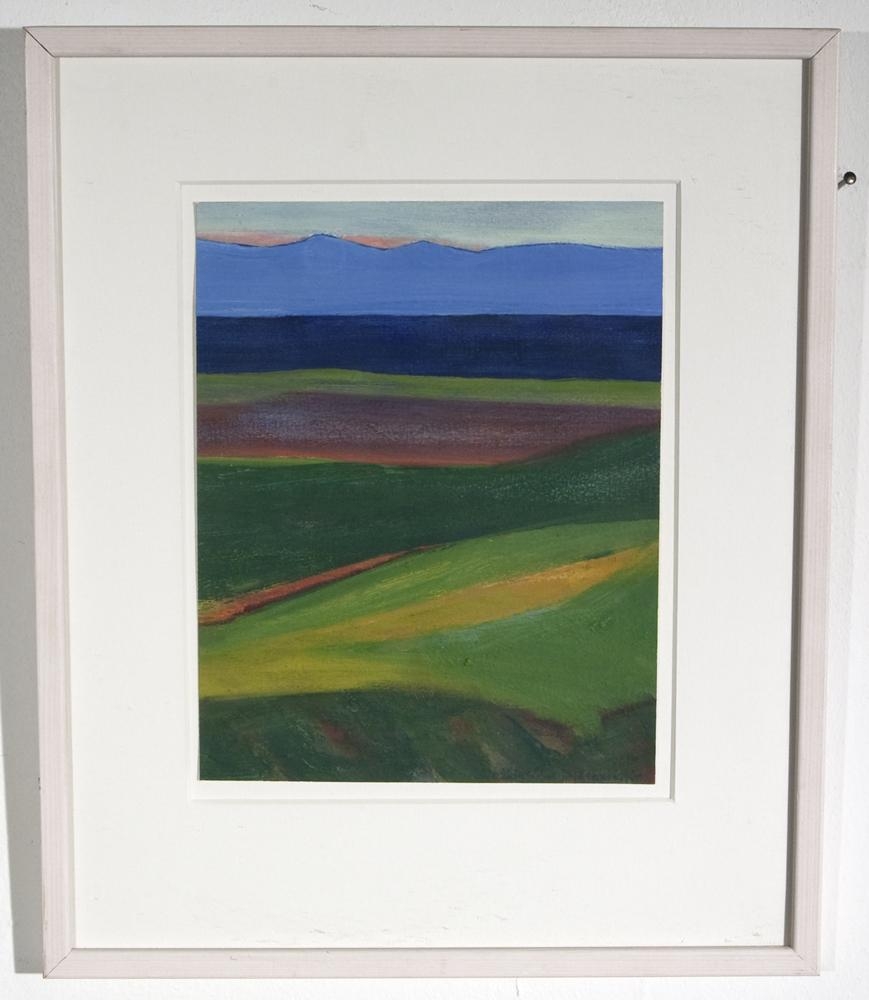 Landslag. Ávala mjúkar og einfaldar línur.Myndin er á undirlagi. Hvítur pappi utan um verk. Víðarrammi er málaður hvítur. Rammi er festur að baki með límbandi. Verkið er hengt með vír. Hugsanlega er undirlag og bak það sama.Á baki verksins kemur fram titill verks, 18.000 kr., Dimmblár sjór, olía á pappír ´96 og nafn listamanns.