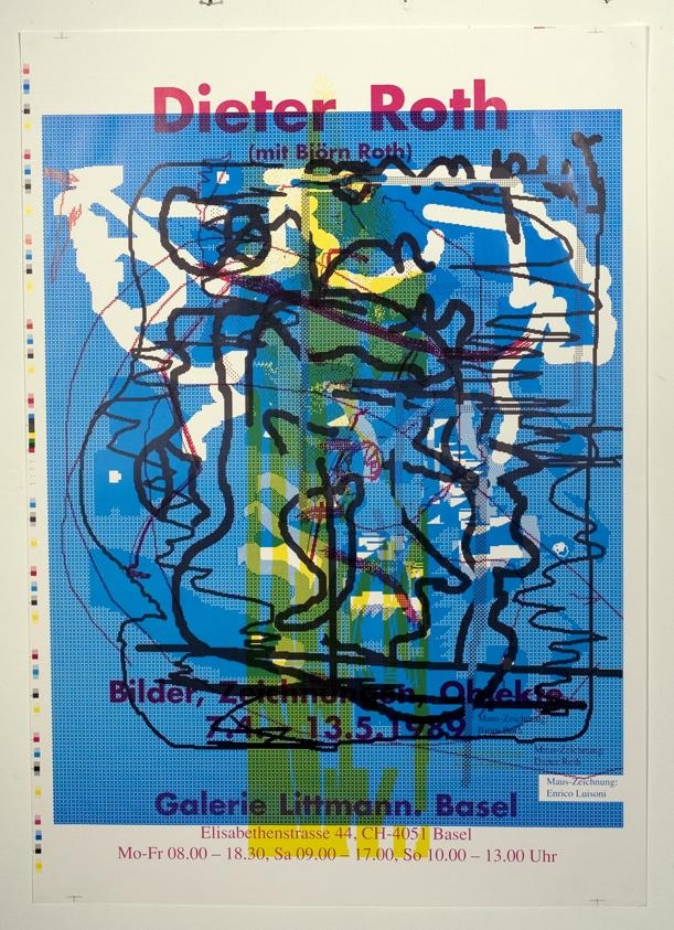 Alls 3 plaköt sem auglýsa sýningu Dieter Roths, Klaus Littmann, Enrico Luisoni og Björn Roth í Galerie Littmann í Basel. Eitt er með óreglegum formum þar sem blár er mest áberandi. Titil plakatsins er í bleikum lit. Annað er líka með óreglegu formum þar sem blár er mest áberandi. Enn titil plakatsins er svartur. Þriðja plakatið er með óreglegu formum þar sem gulur er mest áberandi. Á því er prentað tvisvar á sömu hlið. Á annari hliðinni kemur fram viðfangsefni sem tengist ekki sýningunni. Þriðja plakatið virðist vera prufa.
