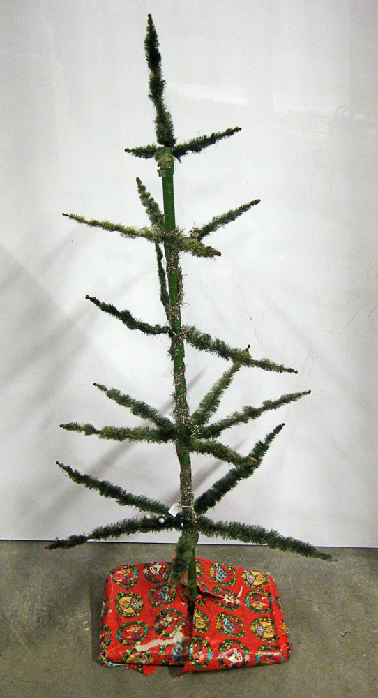 Jólatré úr við og vír með plast efni sem líkir eftir greni. Stofnin er gerðu úr viðarskafti sem vír er stungið í til að mynd greinar. Tréð stendur á tréfæti sem er klæddur rauðum jólapappír.