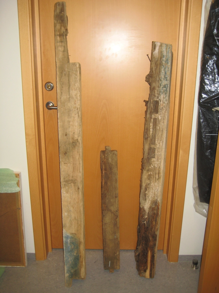 Þrír viðarbitar úr Búrfellskirkju. Í timbrinu má sjá hvar tekið hefur verið úr fyrir stoðir. Örlar á blárri málningu.