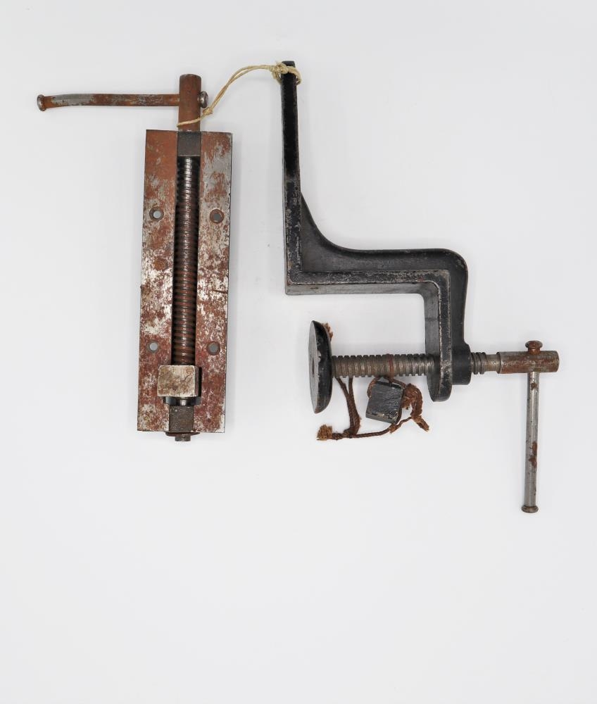 Þvingur, klemmur. Í tveimur hlutum, festir saman með bandi.