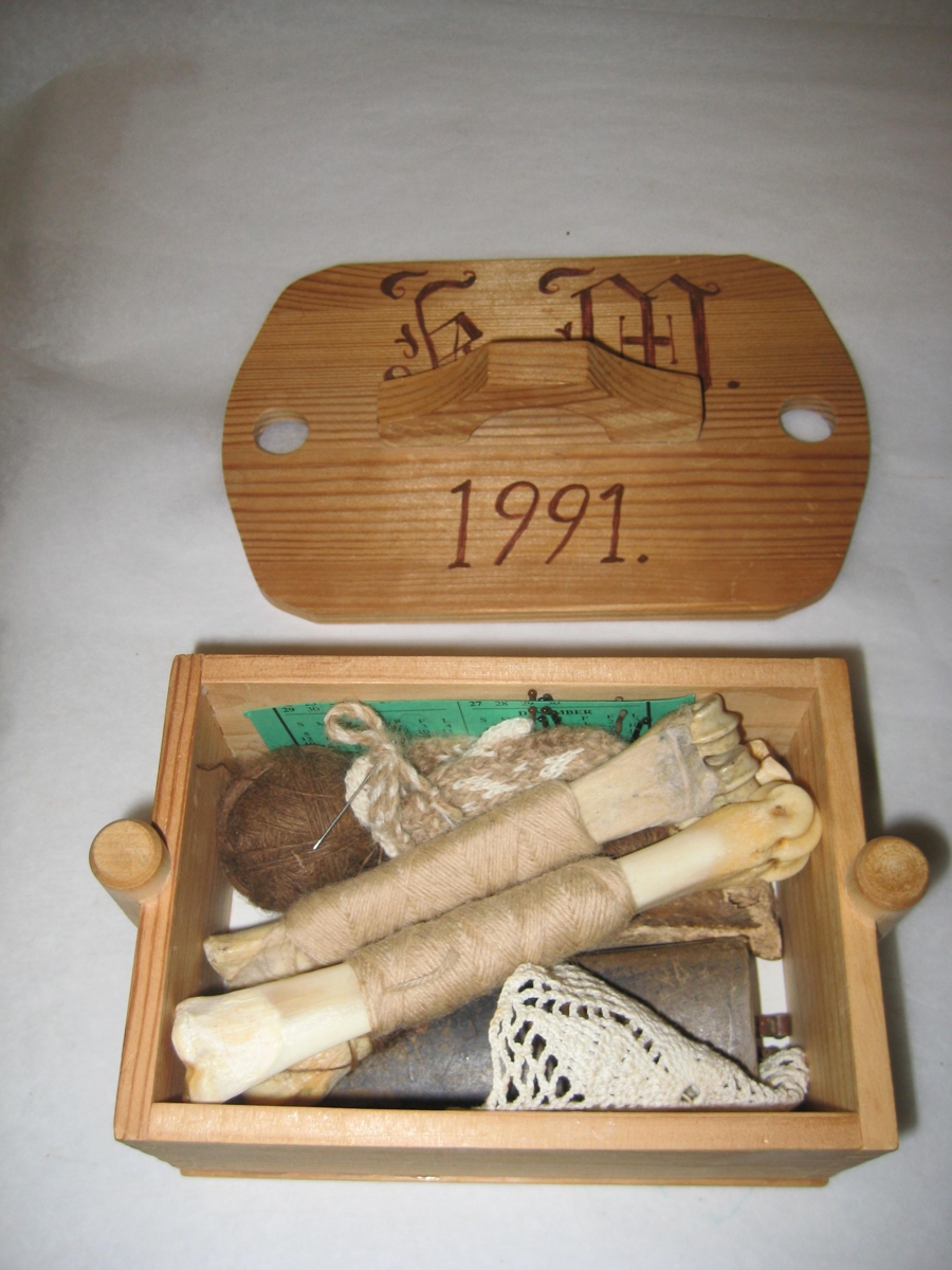 Saumaaskja úr furu. Kisumynd er máluð á hliðina og á lokið eru málaðir upphafsstafirnir K.M. og ártalið 1991. Innihald öskjunnar samanstendur af óskrifuðu jólakorti,leggjabeini, bút af dagatali úr grænu kartoni með 6 hárspennum á, hnykil af brúnu ullarbandi, hvítru heklaðri dúllu, pari af örsmáum prjónavettlingum, 3 leggjarbeinum með ullarbandi vöfðu uppá og viðarhólkur með 5 nálum.