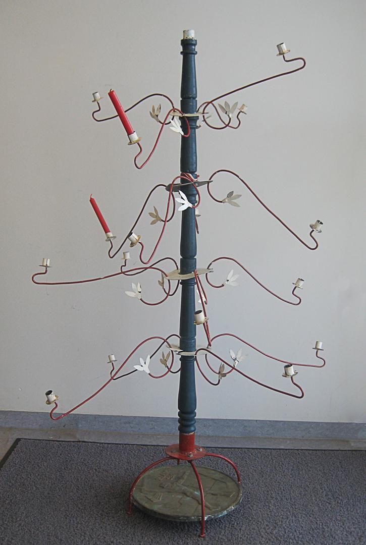 Gervi jólatré úr málmi. Stofnin er blár og armar rauðir með hvítum blómum sem eru kertastjakar. Fóturinn er úr þungri málmsteypuskífu með mynd af víking með reist sverð og á henni stendur "'Ísland 930".