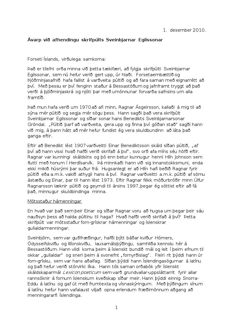 Skrifpúlt Sveinbjarnar Egilssonar rektors og skálds (f. 24.12.1791, d. 17.8.1852). Eftir hann eignaðist sonur hans, Benedikt Sveinbjarnarson Gröndal, skáld, púltið. Eftir að Benedikt lést árið 1907 varðveitti Einar Benediktsson skáld púltið. Ragnar Önundarson afhenti púltið til eignar og skráningar í Þjóðminjasafn Íslands. Hann gaf púltið til minningar um afa sinn, Ragnar Ásgeirsson (sjá meðfylgjandi ávarp sem Ragnar flutti við afhendingu púltsins á Bessastöðum 1.12.2010).