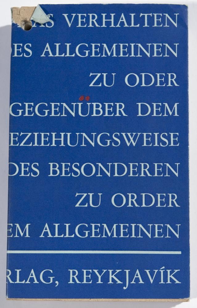 Fremst er texti á þýsku, á eftir kemur sami stafurinn eða rittáknið margendurtekið á hverri blaðsíðu. Bók í mjúku kiljubandi með blárri kápu; ljósblár texti á kápu: innihald er þýskur texti fremst en eftir það er sami stafurinn eða rittáknið margendurtekið á sömu blaðsíðunni: gat í gegnum bókina efst í vinstra horni: blaðsíðurnar óskornar efst.