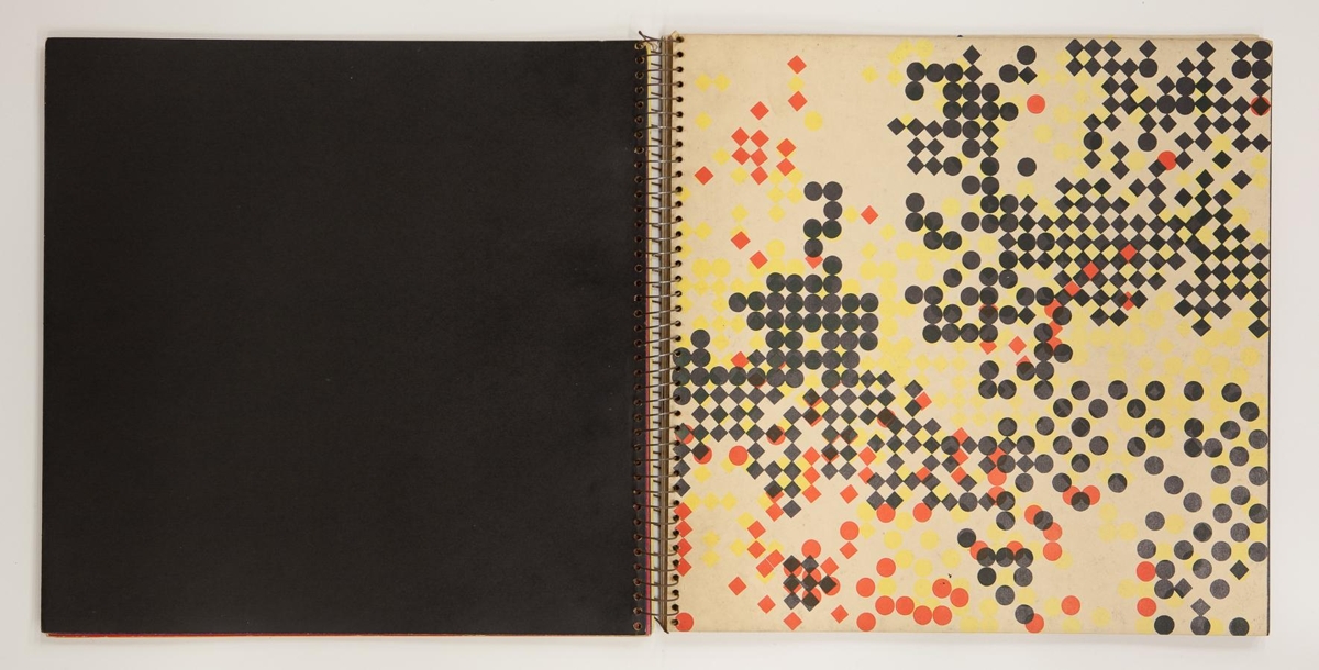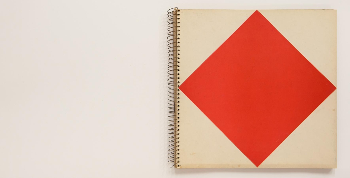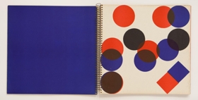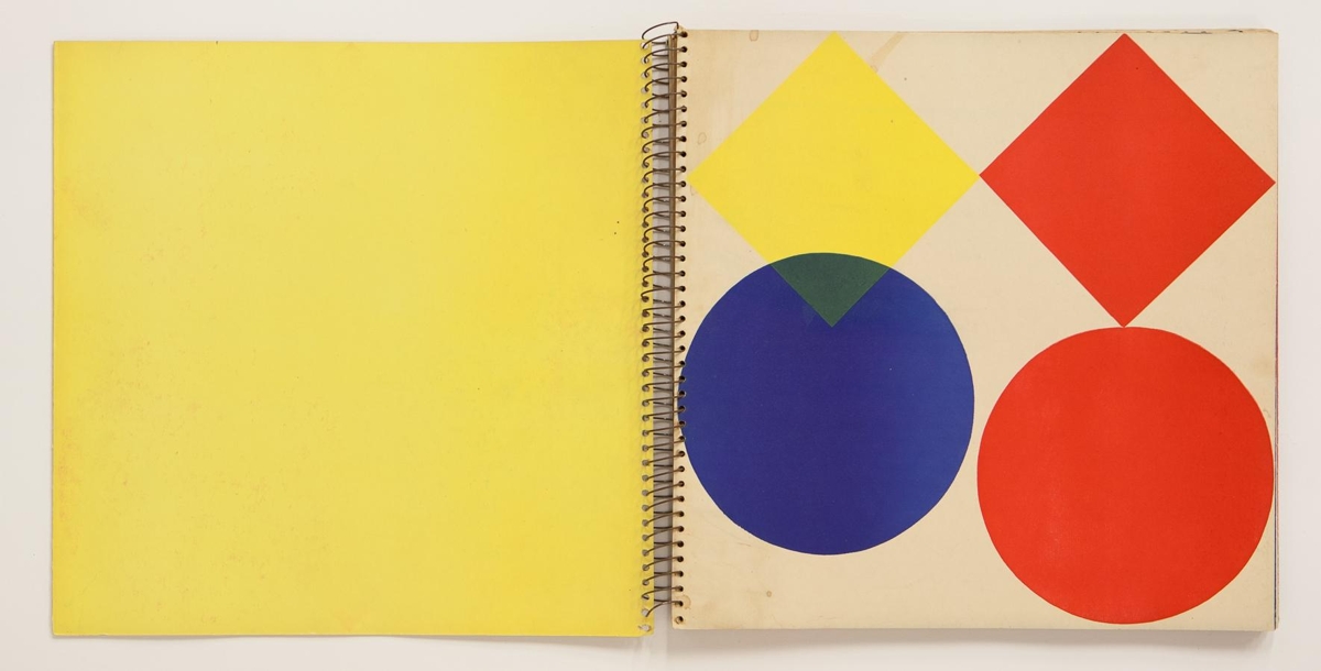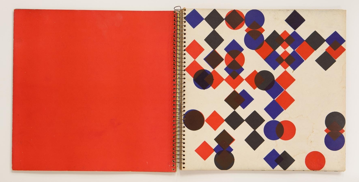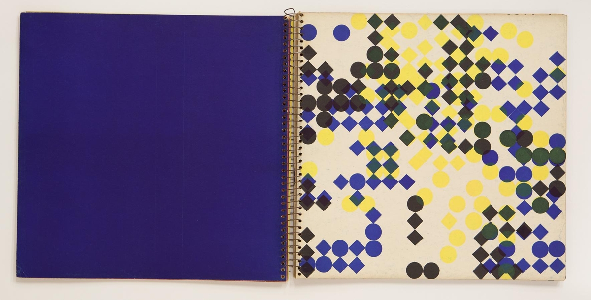 The artist’s book consists of geometric images by Dieter Roth. The book is 13 unnumbered double sheets or 26 pages in four colour print on matte paper. The book is in spiral binding with no cover. The images are printed on every other page and the other pages are monochrome. The artist’s book was published in 1957 in 25 signed copies with cutouts and approx 75 unsigned copies without cutouts. The cover of this exemplar is missing and it is not signed and without cutouts.
