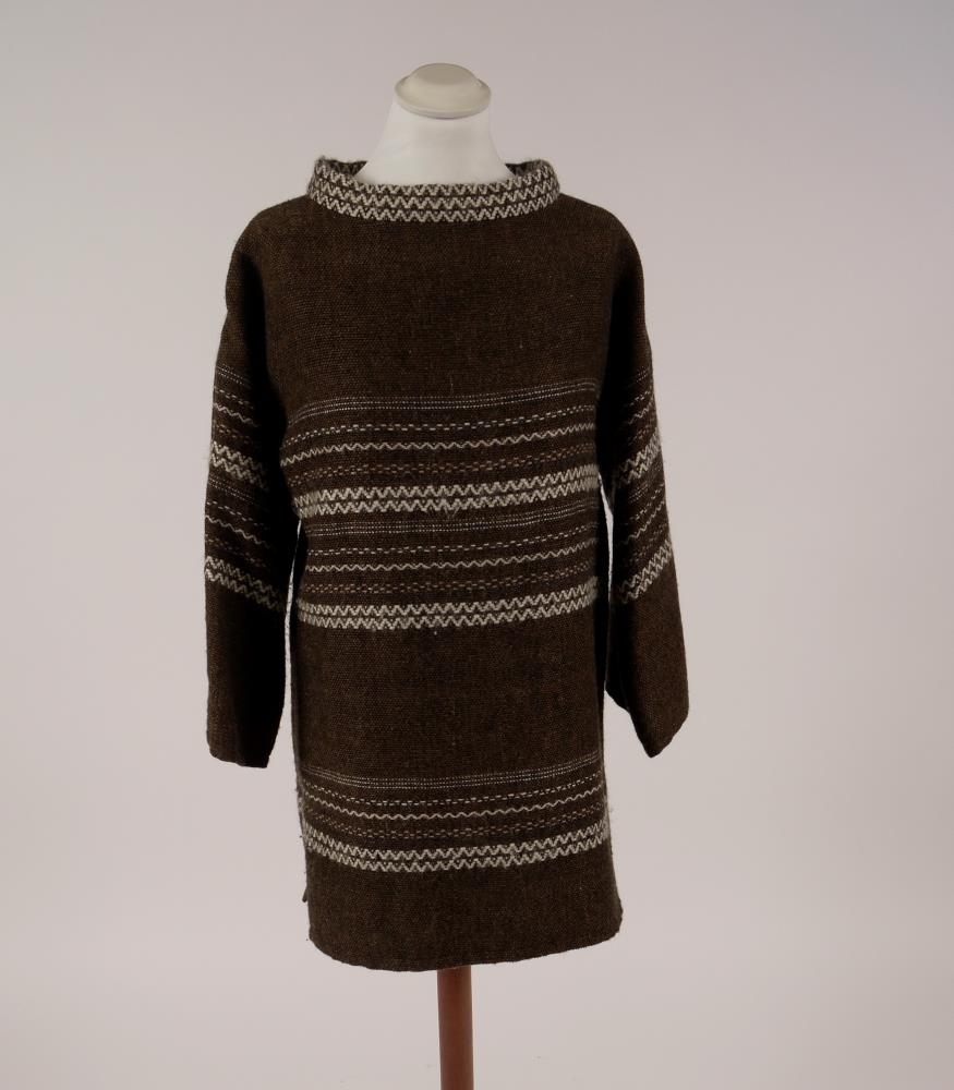Dökkbrún, hvít og grá mussa. Efni ofið úr ull.