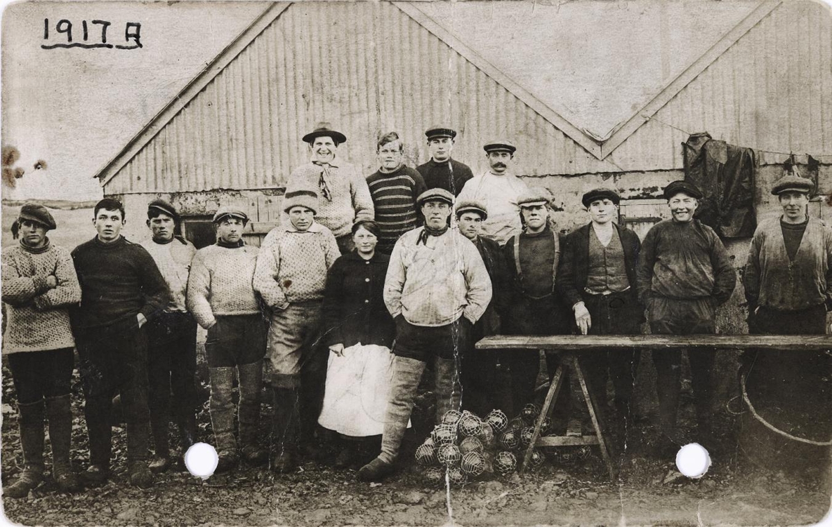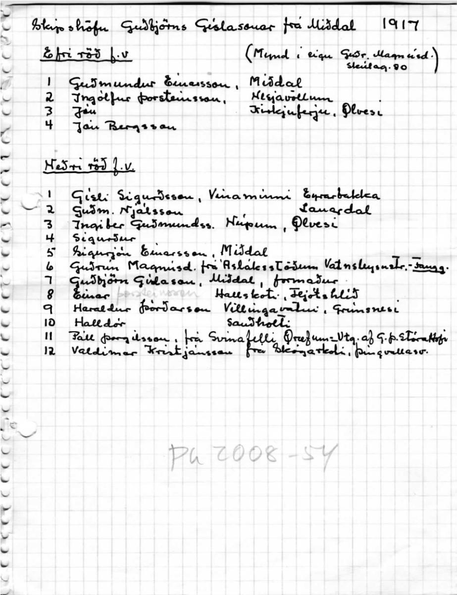 Skipsáhöfn Guðbjörns Gíslasonsr frá Miðdal við verbúð þeirra í Þorlákshöfn. Sjá nánar innskannað fylgiblað í skjalaglugga.
