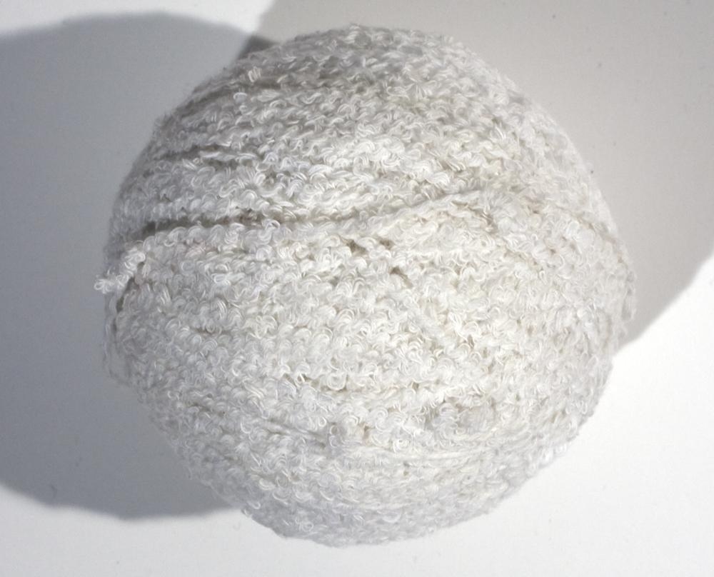 Garnhnykill úr hvítum bómull, hrjúf áferð.Einn endi garns er utaná liggjandi á hnyklinum.