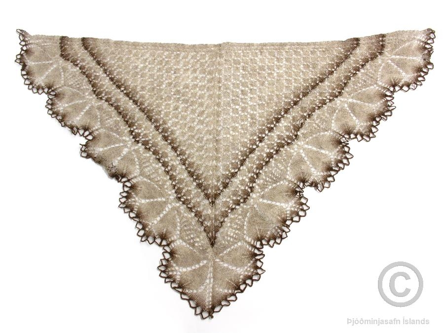 Sjal, hyrna, úr handspunnu þrinnuðu þelbandi í mórauðum litbrigðum. Það var Helga Hannesdóttir á Skáney í Reykholtsdal (f. 1878, d. 1948) sem spann þelbandið en gefandi, Vigdís Pálsdóttir (f. 1924), systurdóttir Helgu, prjónaði hyrnuna. Í bréfi frá Vigdísi segir m.a.: „Á Skáney í Reykholtsdal bjó um langa hríð Helga Hannesdóttir, ættuð frá Deildartungu. Hún var afbragðs tóvinnukona, vandlát og velvirk en auk þess afkastamikil. Á garðyrkjubýlinu Víðigerði í Reykholtsdal bjuggu hjónin Petrea og Benedikt Guðlaugsson. Á merkisafmæli Petreu fékk hún að gjöf handspunnið þrinnað þelband í mórauðum litbrigðum frá Helgu á Skáney. Nú dróst að prjóna sjal úr bandinu. Helga féll frá og seinna Petrea frá hálfprjónuðu sjali. Þá var það dag einn að Benedikt kom í heimsókn til mín með bandið og spurði hvort ég vildi ekki prjóna úr því sjal [...]. Hér er hyrnan úr þessum samkembdu mórauðu litum ásamt sýnishorni af bandi.“ (sýnishornin eru nr. Þjms. 2011-14-3). Inga Lára Baldvinsdóttir, fagstjóri Ljósmyndasafns Íslands í Þjóðminjasafni, afhenti gripi nr. Þjms. 2011-14 fyrir hönd Vigdísar móður sinnar.