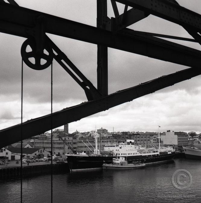 Reykjavíkurhöfn úr kolakrananum. M/s Magni dregur m/s Gullfoss inn í fyrsta skifti, júlí 1955.