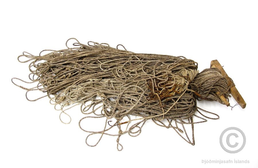 Haukalóð (flyðrulóð) frá bænum Haga á Barðaströnd. Haukalóð var lögð fyrir lúður, ekki síst á Breiðafirðinum. Talið er að ekki hafi verið farið að nota haukalóð til lúðuveiða fyrr en seint á 18. öld. Flyðruönglar voru kallaðir haukar eða hneifar. Algengasta heiti flyðrulóðar var haukalóð, en hún var einnig kölluð haukalína, snæri, sprökusnæri, hneifasnæri, sprökulóð, hneifalóð, dráttarlóð, lúðulóð og jafnvel lúðulóð, því á hana veiddist oft engu síður skata en flyðra. (Lúðvík Kristjánsson. Íslenzkir sjávarhættir, III. Reykjavík 1983, bls. 257. Nánari upplýsingar um haukalóð er að finna í sama riti bls. 258, 263-264 og víðar). Efst á lóðinni er tréspýta eða hald og á henni eins konar hanki. Snærið er svo vafið í hönk og hengt á haldið (lengd uppvafin er um 110 cm). Á endum snærisins er fjöldi öngla. Þeir eru orðnir nokkuð ryðgaðir en að öðru leyti er lóðin í góðu ástandi. Gefandi er Bjarni Hákonarson, bóndi í Haga á Barðaströnd, en eigandi og notandi lóðarinnar var faðir Bjarna, Hákon Kristófersson, alþingismaður og bóndi í Haga. Bjarni hefur í mörg ár geymt lóðina í því skyni að koma henni í vörslu Þjóðminjasafnsins. Þór Magnússon, fyrrum þjóðminjavörður, sótti haukalóðina til Bjarna og afhenti safninu fyrir hans hönd.