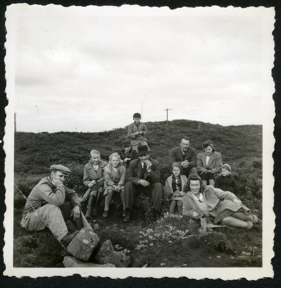 Hópur fólks, börn og fullorðnir, sitja í grónu lyngþúfubarði. Við myndina er skrifað: 1944.