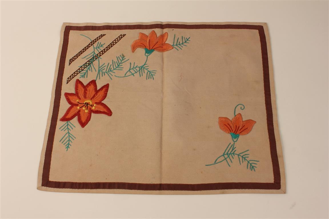 Lítill dúkur eða diskamotta, ljósbrúnt bómullarefni, útsaumur blómamunstur.