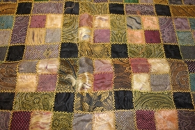 Dúkur, bútasaumsdúkur eða veggteppi, smáir teningar í ýmsum litum, kaðall á jöðrum með lykkjum á hornum, fóðraður.