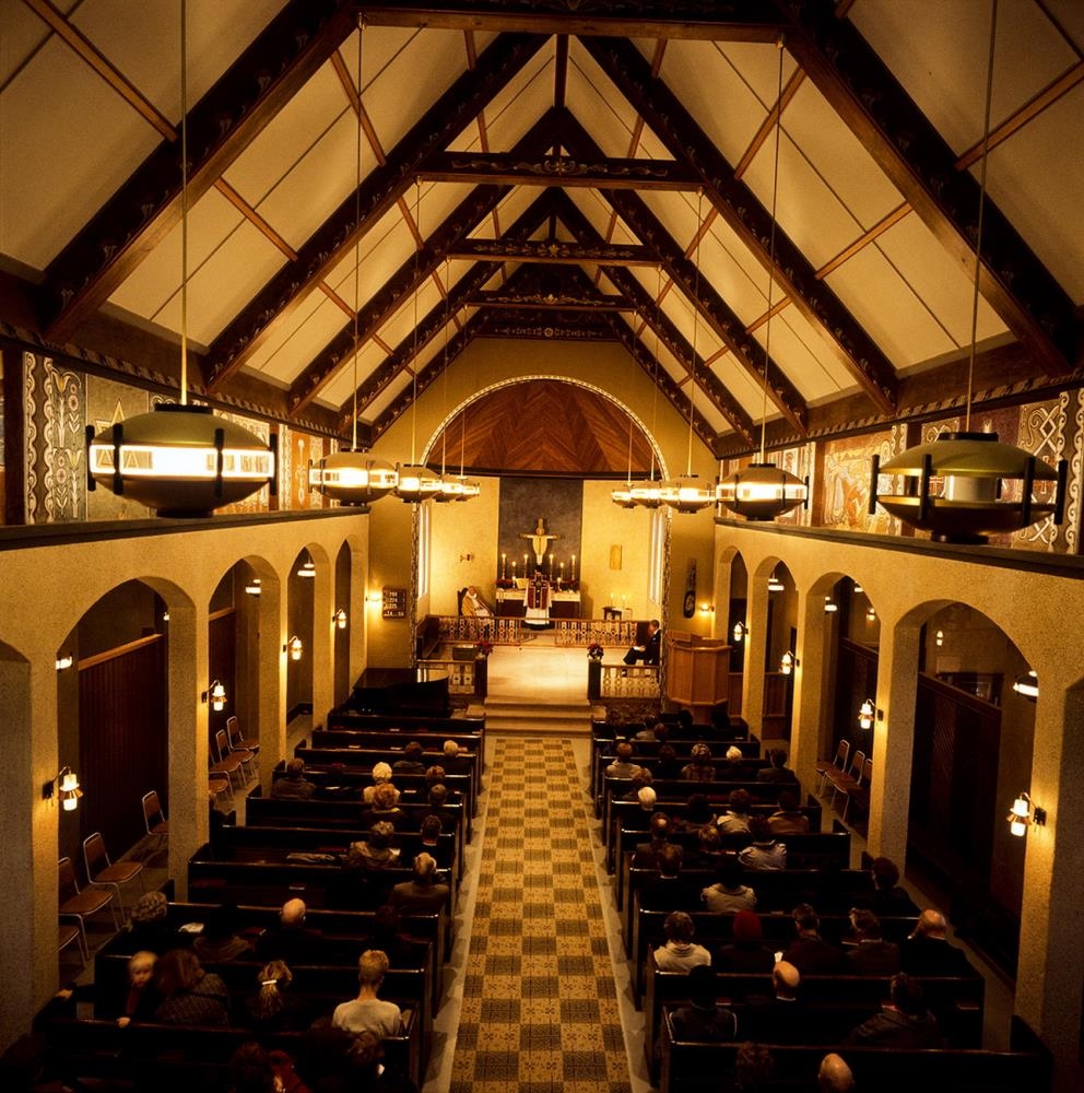 Kirkjan að innan, biskupinn hr. Pétur Sigurgeirsson vígir kirkjuglugga, mósaik og kirkjuklukkur.