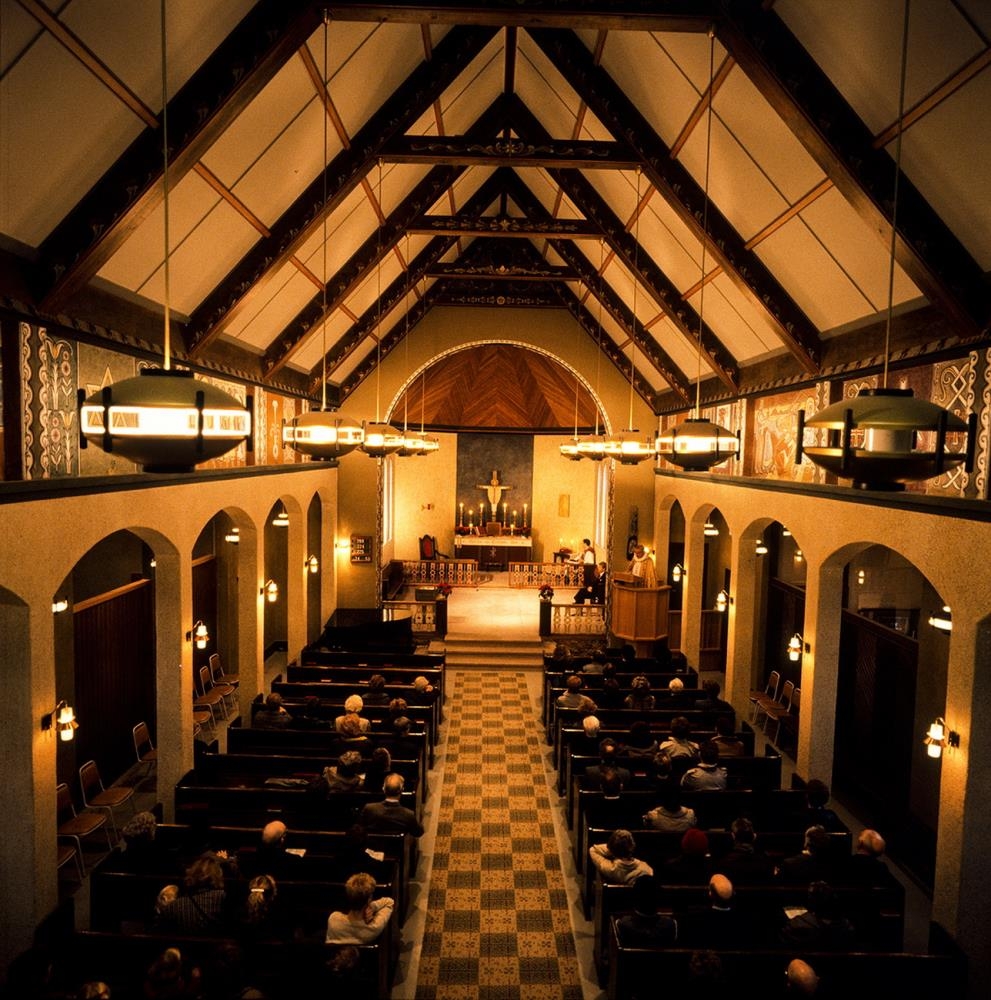 Kirkjan að innan, biskupinn hr. Pétur Sigurgeirsson í predikunarstóli.
