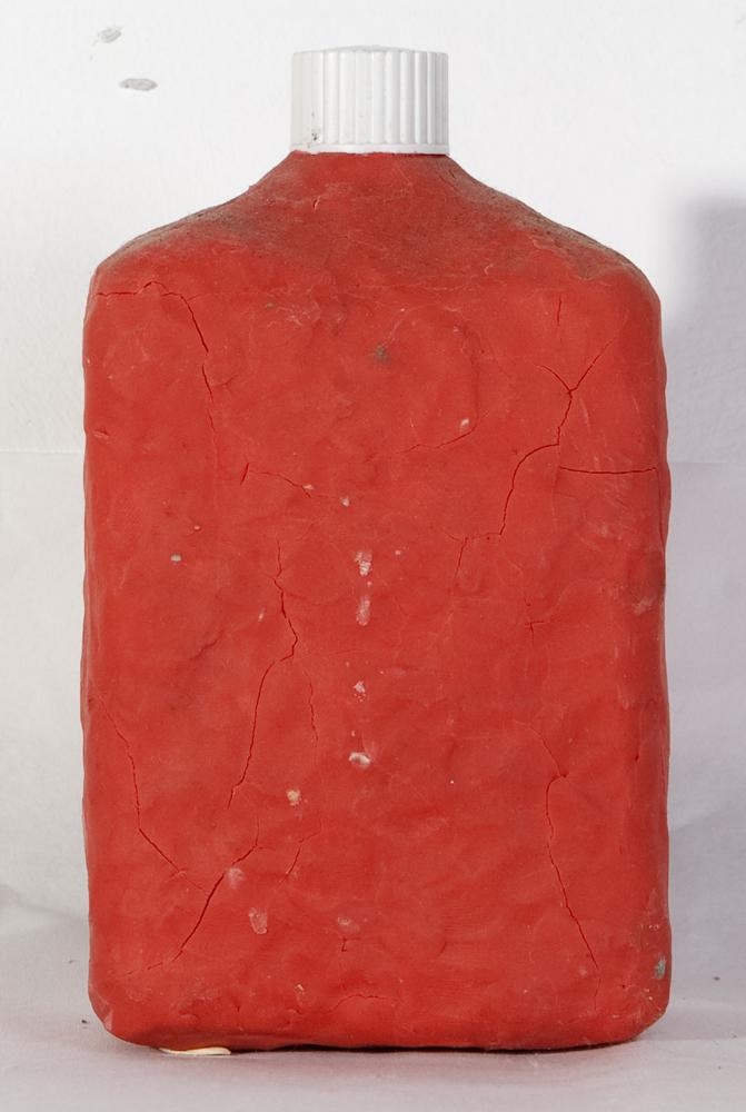 Ferningslaga plast hlutur (flaska) hulinn rauðum mjúkum leir, hvítur tappi efst.