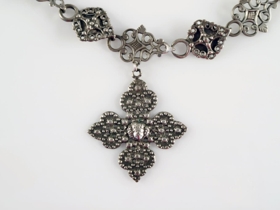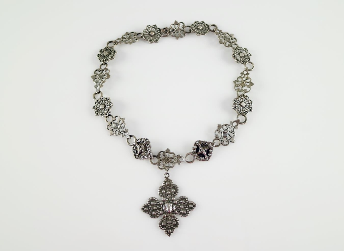 Millufesti, það er hálsfesti sem útbúin er úr upphlutsmillum sem festar eru saman. Festin sjálf er samsett úr 16 millum af þremur mismunandi gerðum. Nistið er gert úr fjörum millum sem kveiktar eru saman þannig að þær mynda kross. Fyrir miðju krossins er engilsmynd (kerúb). Festin er 47 cm löng. Krossinn (mældur með lykkju efst) er 5,5 x 4,9 cm.