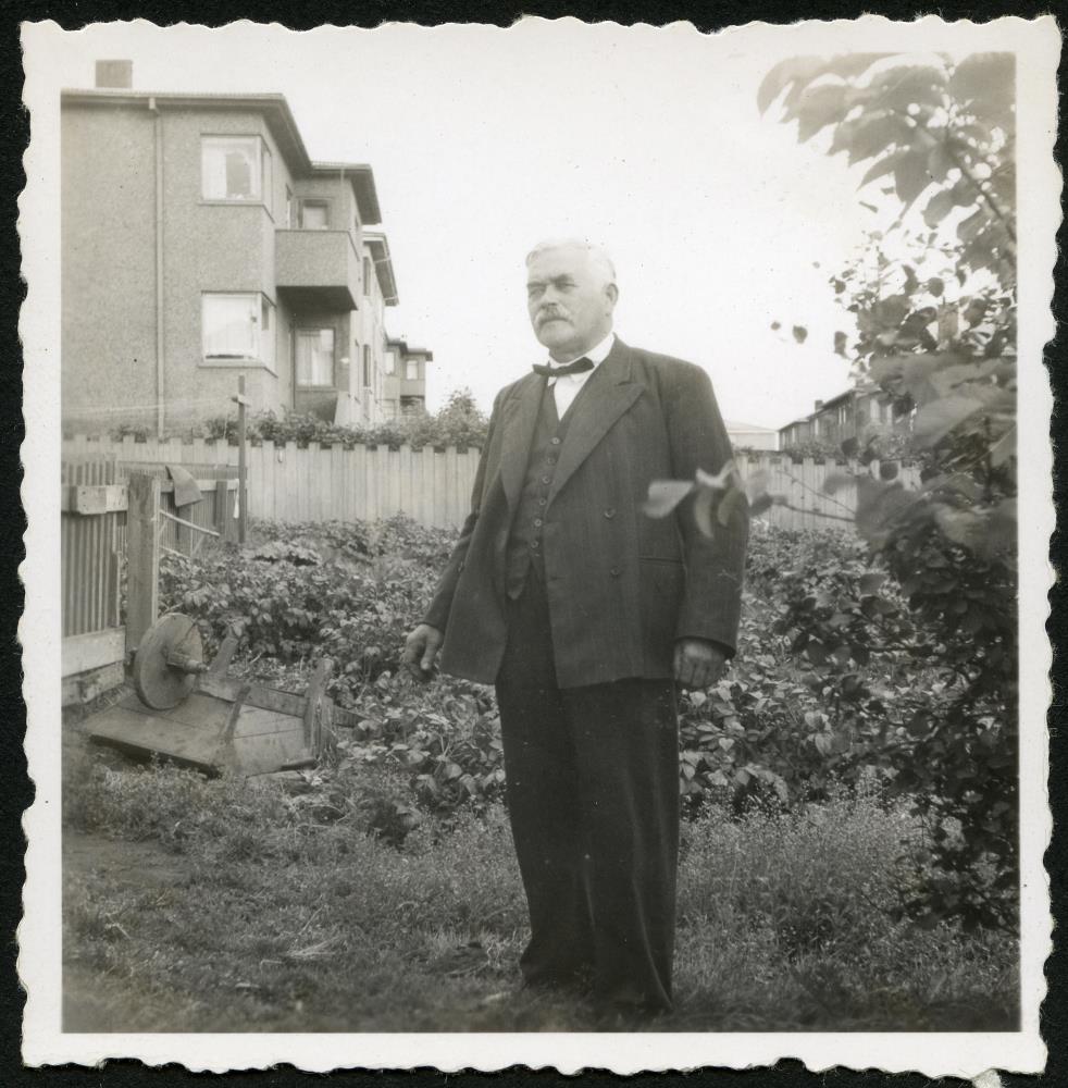 Jafet Sigurðsson úti í garði á sötugsafmælinu. Við myndina er skrifað: 3. ágúst 1944. Jafet Sigurðsson 70 ára.