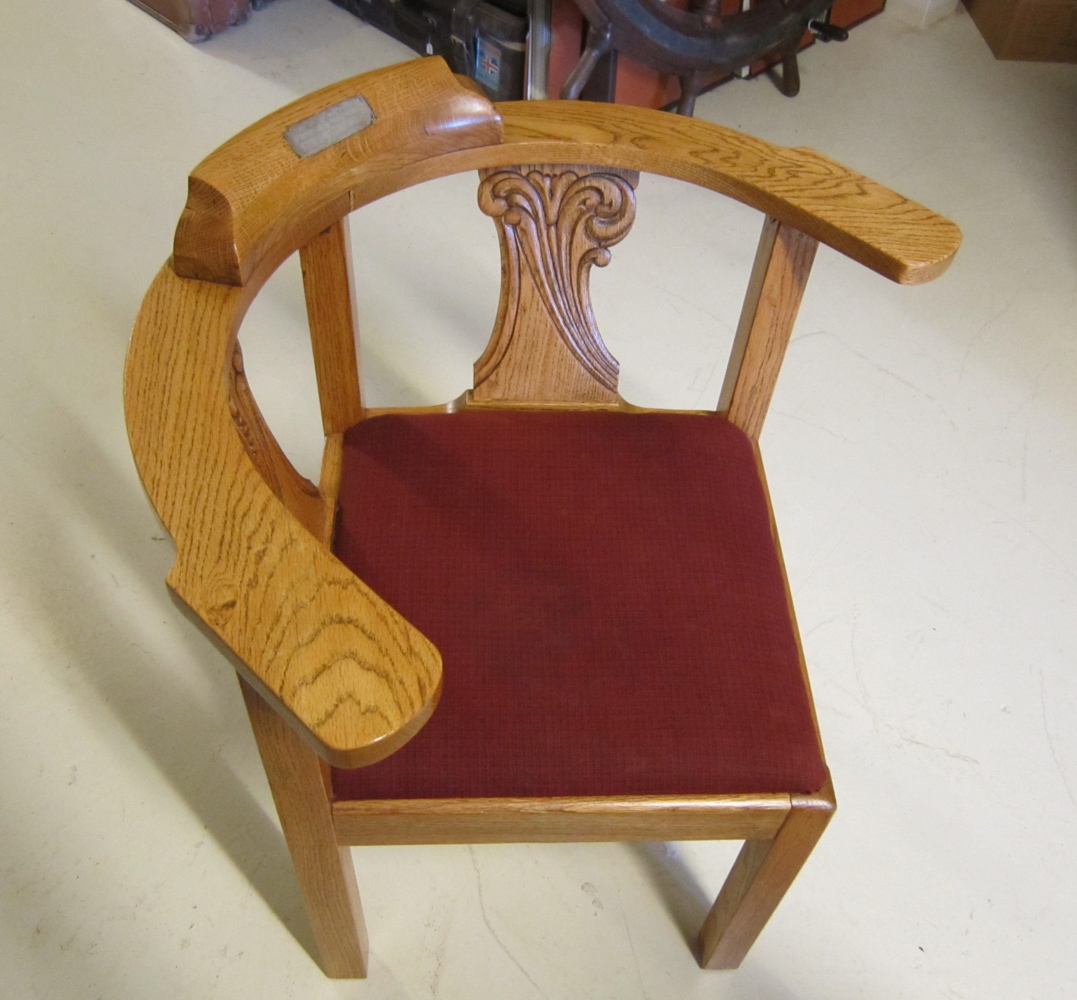 Stóllinn fylgir skrifborði nr. 5009 og stól nr. 9737. Stóllinn er úr dánarbúi foreldra gefenda, Einars Kristleifssonar og Sveinbjargar Brandsdóttur, Runnum, Reykholtsdal. Á stólnum er silfurplata með áletruninni: “Kristleifur Þorsteinsson, fræðimaður á Stóra-Kroppi. Vinargjöf frá héraðsbúum”. Kristleifur (1861-1952) var fyrst giftur Andrínu Guðrúnu Einarsdóttur (1859-1899) en missti hana árið 1899 og kvæntist Snjáfríði Pétursdóttur ári síðar. Hún var frá Grund í Skorradal, fædd 12. maí 1862, dóttir Péturs Þorsteinssonar og Kristínar Vigfúsdóttur. Hún var skírð í höfuðið á föðurömmu sinni, Snjáfríði Bjarnadóttur frá Vatnsenda í Skorradal. Líklegt er að Guðmundur Frímann í Reykholti hafi smíðað stólinn og borðið. Hæð stólsins er 78 cm, stólsetan er úr rauðu taui, 46 x 46 cm og útskurður í baki hans. Gefendur 18. júlí 2001, systkinin frá Runnum í Reykholtsdal, börn Einars Kristleifssonar og Sveinbjargar Brandsdóttur.
