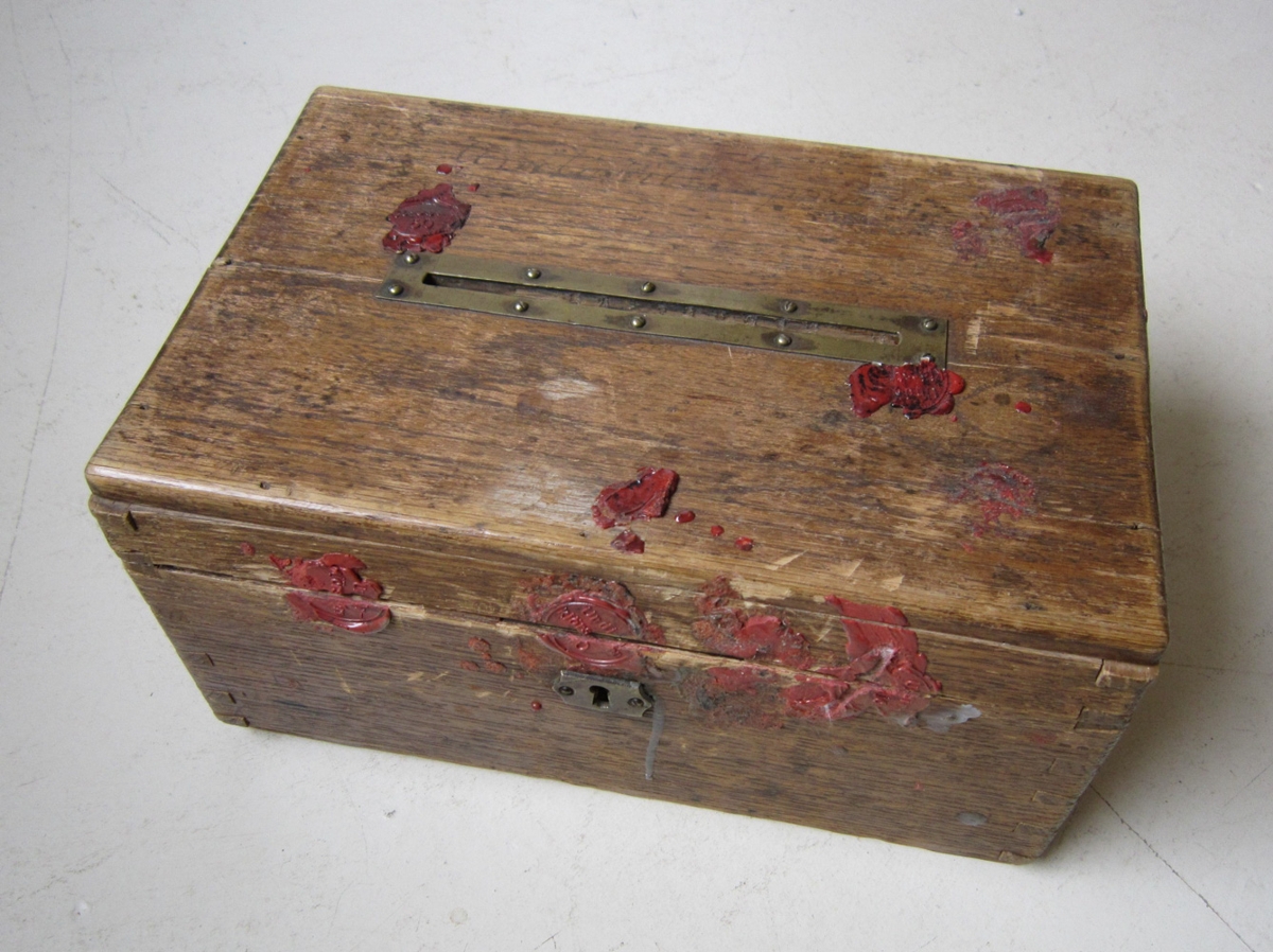 Kjörkassi úr Andakílshreppi. Stærð 31 x 20, hæð15.5 cm, koparklædd rifan á lokinu.