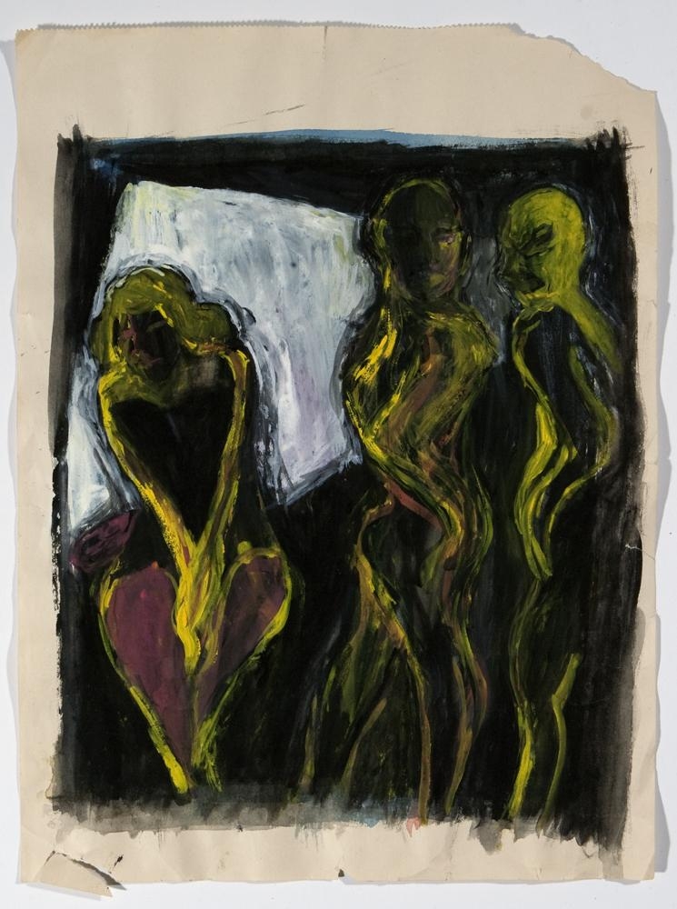 Akrílmálning á pappír Gular útlínur á svörtum fleti - tvennar útlínur af karlmönnum, einar af kvenmanni. Ofarlega á myndfleti er hvítur flötur ofan á svarta fletinum.
