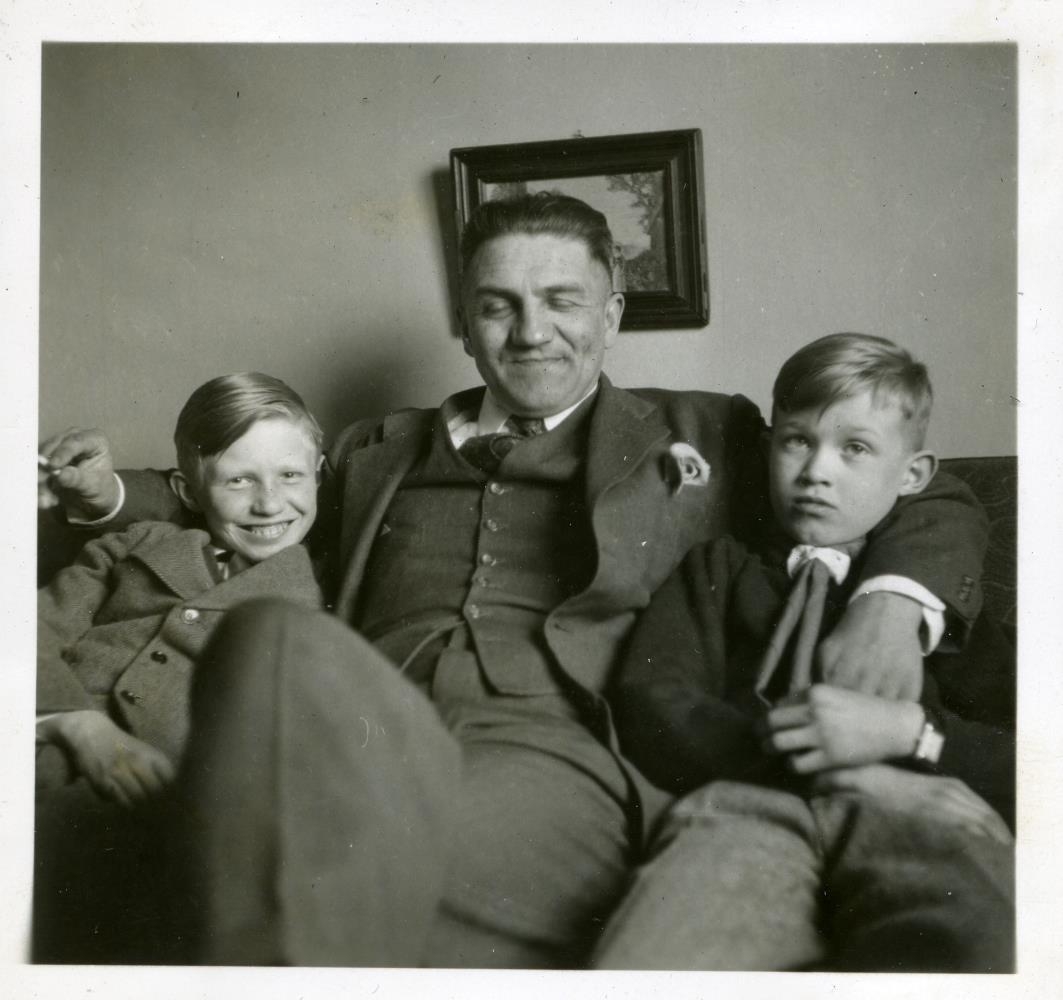 Karlmaður og tveir strákar sitja saman í sófa. Við myndina er skrifað: 1945. Addi - Har[aldur], Grétar.