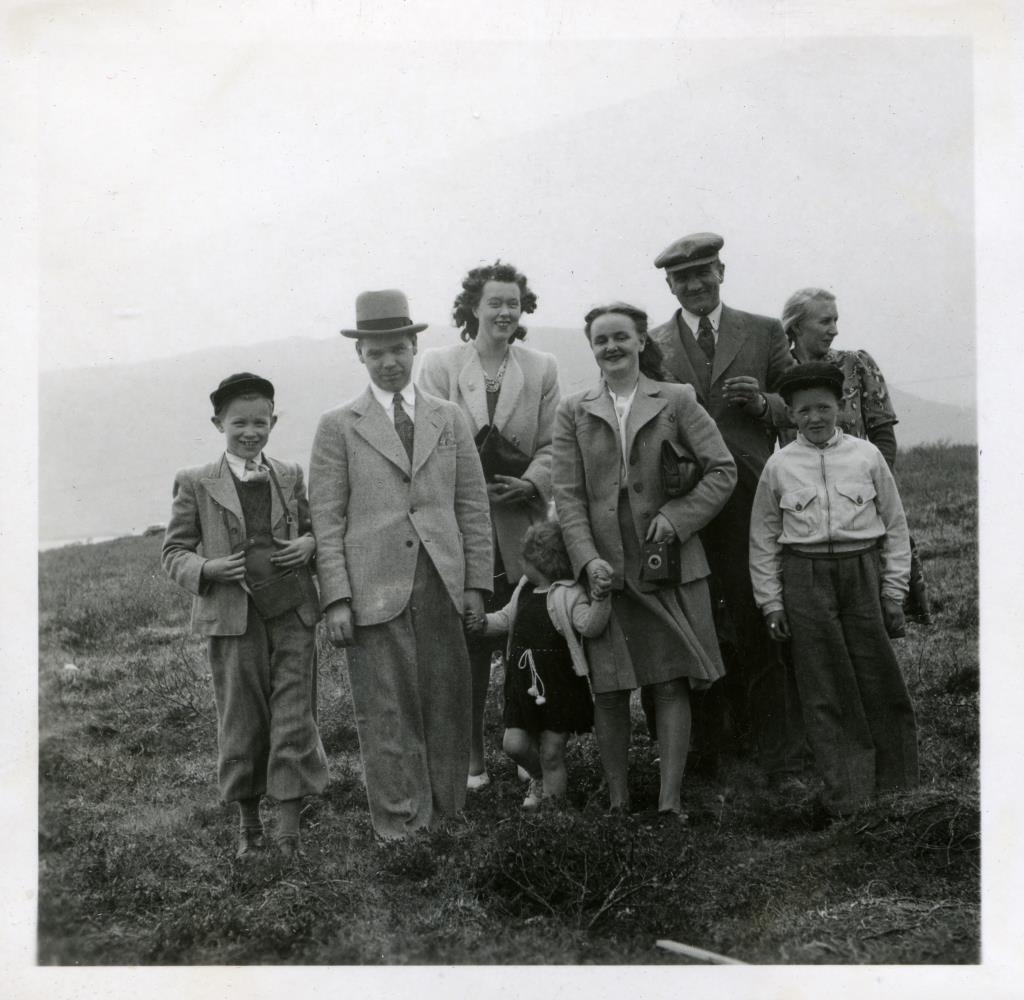 Hópur fólks stendur í dálítilli lyngbrekku. Við myndina er skrifað: 1945. Hópmynd.