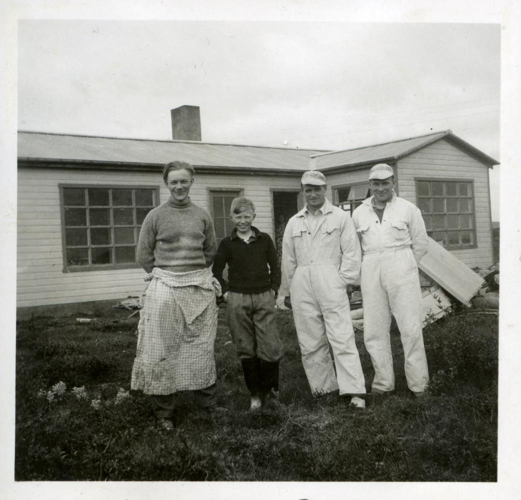 Ásta í dyrunum, Hákon, Jafet og tveir karlmenn í hvítum samfestingum í forgrunni, sumarbústaðurinn í bakgrunni. Við myndina er skrifað: 1945. Málararnir.