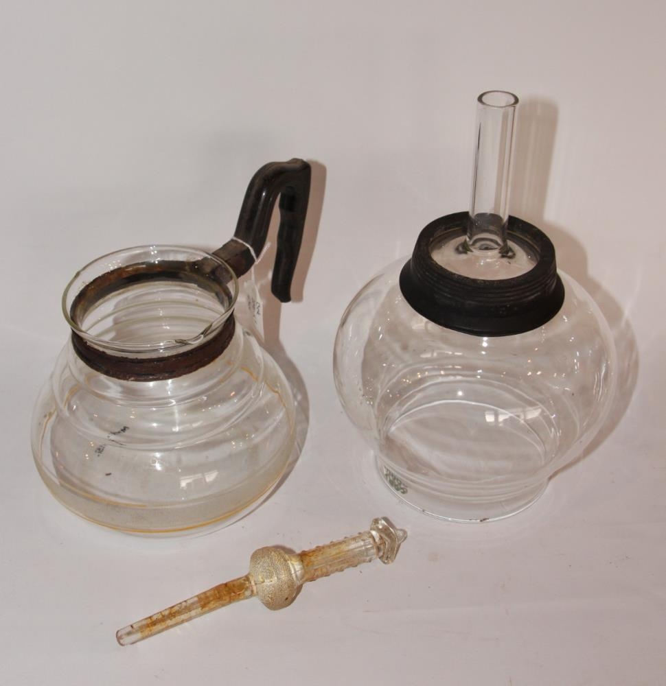 Kaffikanna úr gleri. H. 26 cm. Stór glerkúla ofan á könnunni með stút ofan í sem á er mælistika. Brúnt plastlok er ofan á. Brotið er úr því.