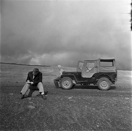 Á Kaldadal. Húsafellsjeppinn M 130. Þorsteinn bóndi f. 6.7.1889 situr á stuðara. Myndin tekin 1946-1950.