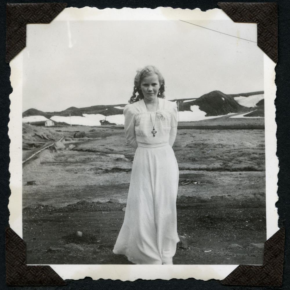 Erna Ingólfsdóttir, mynd tekin utan dyra. Við myndina er skrifað: Vorið 1945. Erna Ingólfsdóttir á fermingardaginn við Skíðaskálann.