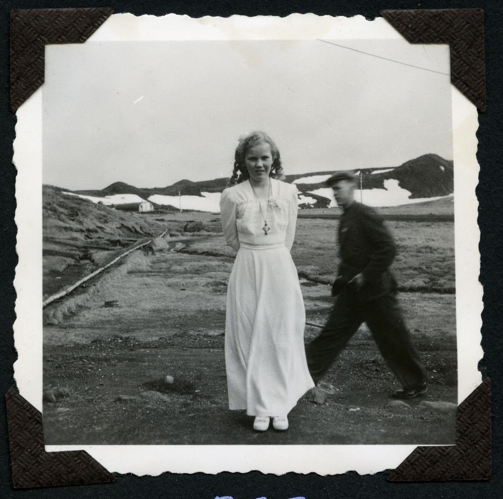 Erna Ingólfsdóttir á fermingardaginn, myndin tekin utandyra. Við myndina er skrifað: Vorið 1945. Erna Ingólfsdóttir á fermingardaginn við Skíðaskálann.