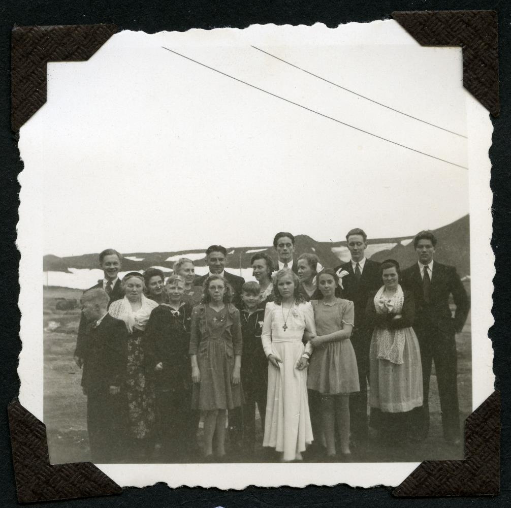 Fjölskylda og veislugestir. Við myndina er skrifað: Vorið 1945. Erna Ingólfsdóttir á fermingardaginn við Skíðaskálann.