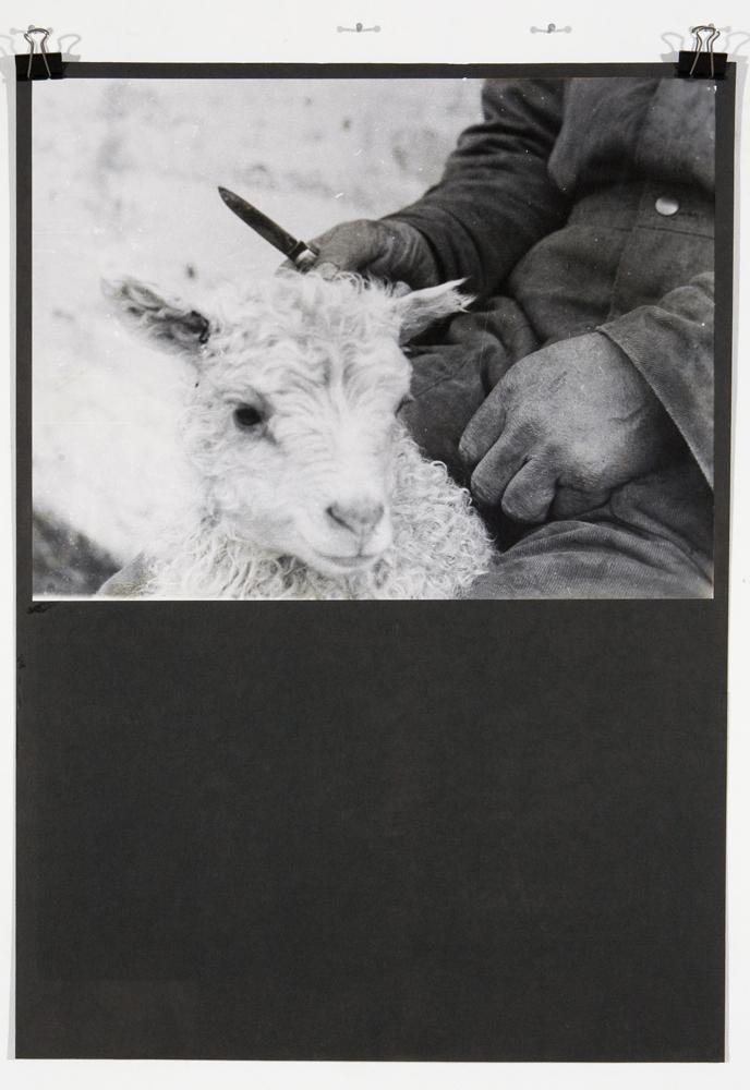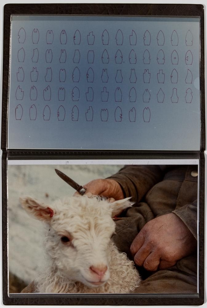 Brún bók með glærum plastvösum, í vösunum eru ljósmyndir af:1. portrettmynd af listamanni; 2. hluti af ferilskrá og sýningum listamanns; 3. ljósmynd af lambi með skorið eyra, maður með hníf heldur um lambið; 4. hluti af ferilskrá listamanns og blaðagreinar; 5. Ljósmynd af lambi, skorðað af milli tveggja fótleggja; 6. hluti af ferilskrá listamanns ásamt athugasemdum; 7. ljósmynd af lambi með skorin eyru, skorðað af á milli fótleggja manns sem heldur á hnífi; 8. yfirlit af mismunandi mörkum, útlínur á blátt blað; 9. Ljósmynd af lambi; 10. Hvítt A4 blað, upplýsingar um verkið á íslensku. Tvö þykk, svört karton. Á öðru þeirra eru 4 ferningar (16x11cm), raðað lárétt, úr þykkum silfruðum pappír. Á hverju ferningi eru myndir af 2 mörkum og útskýring á þeim. Á hinu kartoninu er þykkur silfurpappír, 36,5x47,5 cm, staðsettur fyrir ofan miðju. Á silfurpappírnum er sama mynd og nr. 9 í brúnu bókinni.