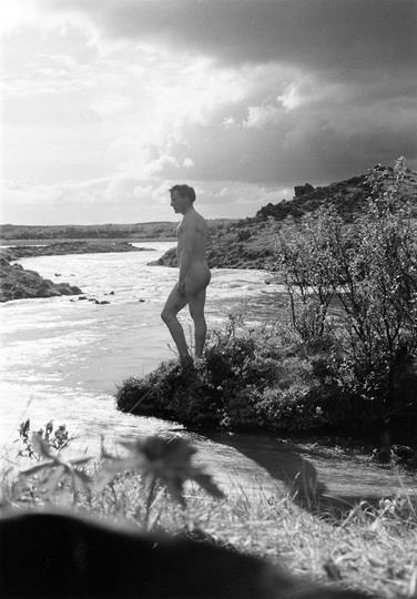 „Vor í Húsafellsskógi“. Oddar, Hvítá í baksýn. Nakinn maður (Þorsteinn Jónsson f. 5.4.1896).