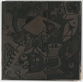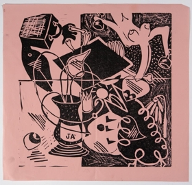 4 þrykk, 1 útskorinn lanolíndúkur, notaður til að þrykkja myndirnar - svört málning- 1 mynd á hvítan pappír, 3 á bleikan. Myndefni: Líkamar án hausa, skeppna, vasi með áletruninni 'Já', auga. Myndflöturinn er ljósari vinstramegin og dekkri hægramegin1 útskorinn lanolíndúkur á krossviðsplöu. Dúkurinn hefur verið notaður til að þrykkja myndirnar.
