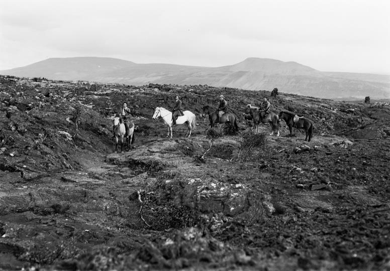 Ferðalangar í Hallmundarhrauni. Útfjall og Reyðarfell í baksýn. Á götunni yfir hraunið frá Barnafossi til Gilsbakka. Katrín Helgadóttir skólastjóri í Reykjavík, Bjarnveig Bjarnadóttir síðar forstöðumaður Ásgrímssafns, Ingólfur Möller síðar skipstjóri, Jóhannes Loftsson, skrifstofumaður í Reykjavík. Myndin líklega tekin 1931 eða 1932.
