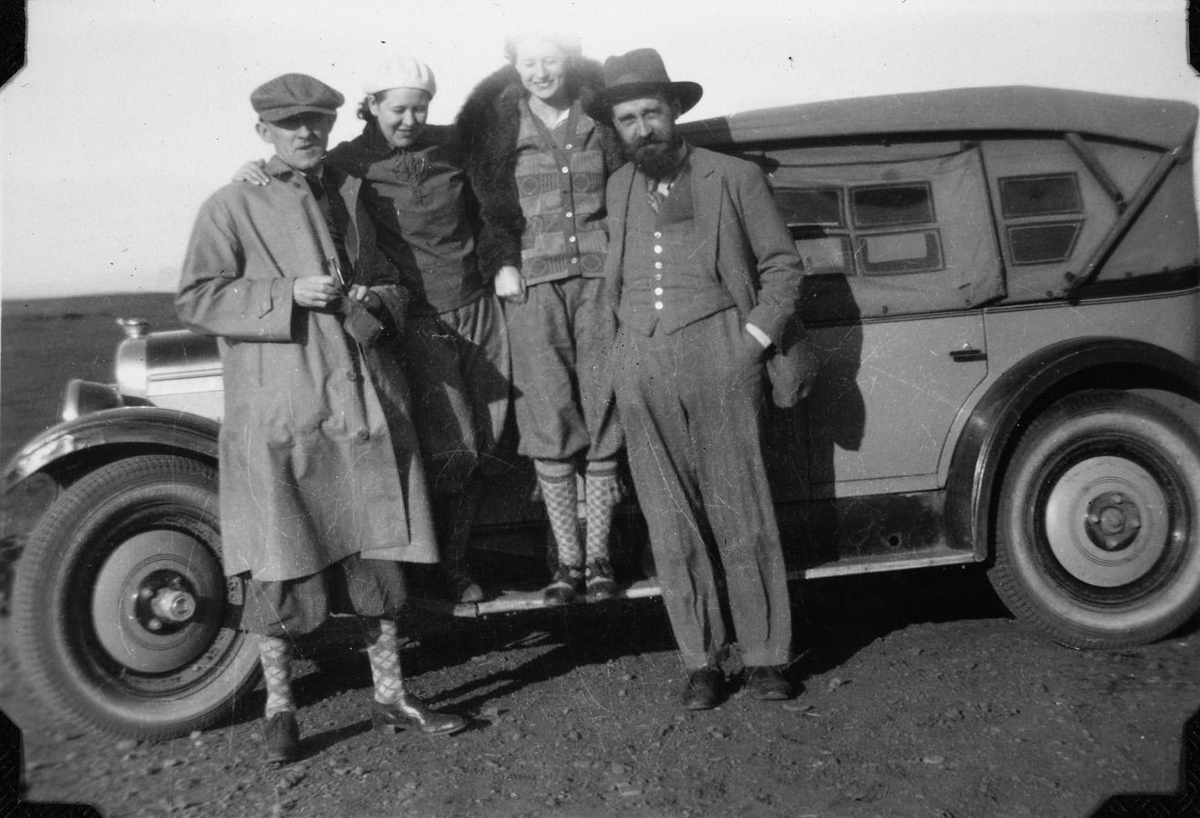Halldór, Inga, Hrafnhildur Einarsdóttir systir hennar og Erlendur í Unuhúsi. Á ferðalagi á Fljótsdalshéraði 1930. Við blæjubílinn - "Litlu gulu hænuna". Úr albúmi Ingibjargar Laxness. 3.-4. áratugur.