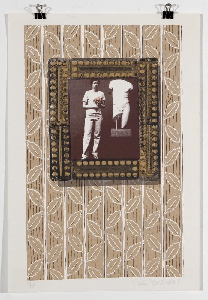 Flatþrykk á ljósan pappír (sennilega silkiþrykk). Bakgrunnur minnir á veggfóður. Rétt fyrir ofan miðju er brún-hvít ljósmynd af hvítklæddri konu, hún heldur á blómvendi. Við hlið hennar er gifsstytta af nöktum líkama, án hand- og fótleggja (rómverkst yfirbragð)- Í kringum allt myndefnið eru myndir af 6 pilluspjöldum, prentaðar í koparlit.