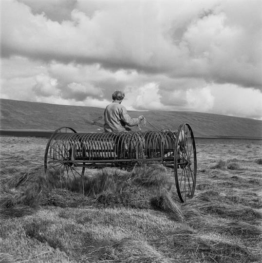 Hestur dregur rakstrarvél. Guðlaugur Jóhannesson f. 5.8.1897.