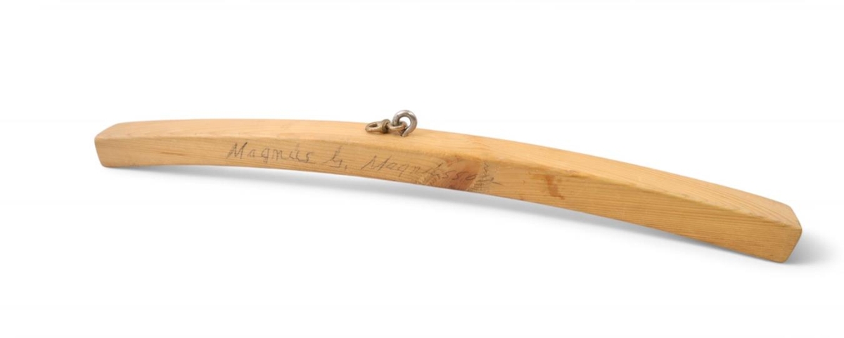 Óvenju þykkt herðatré, sylgjufesting í stað króks. Á tréð er skrifað með blýanti: "Magnús G. (eða S.) Magnússon".