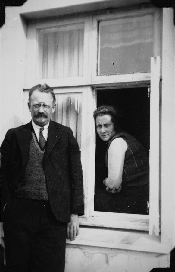 Hjónin Hallbjörn og Kristín(Kidda) við hús sitt við Spítalastíg, 1933. Úr albúmi Ingibjargar Laxness. 3.-4. áratugur.