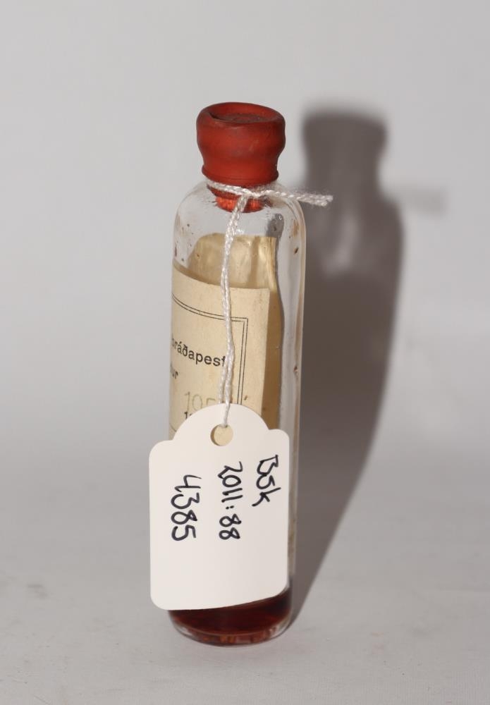 Glerglas fyrir bóluefni. H. 9,5 cm, þv. 2 cm. Bólefni gegn bráðapest í sauðfé. Fyrir 40 kindur. Framleitt af Rannsóknarstofu Háskólans 1953. Glasið er nr. 467. Neðan á glerflöskunni er upphleypt TCW co 2-S 60 USA. Gúmmítappi er á flöskunni sem hægt er að stinga nál í gegnum.
