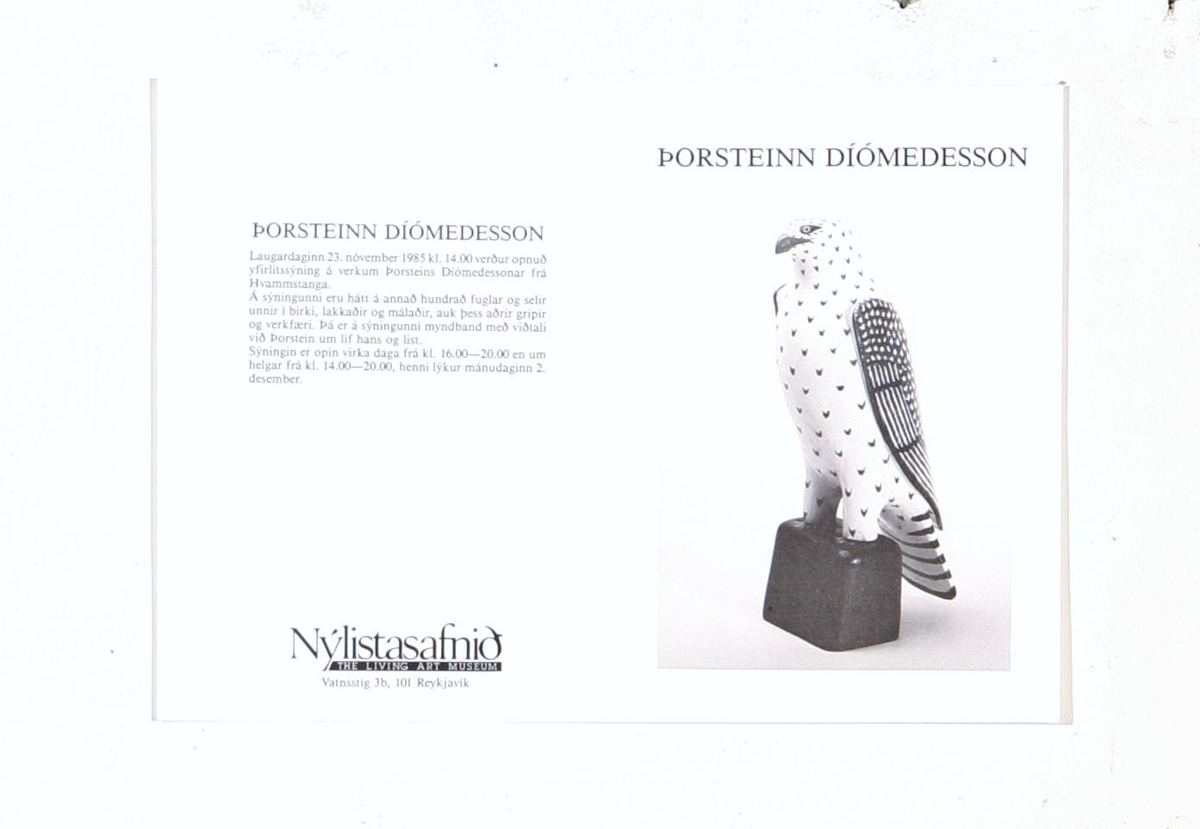 Veggspjald/boðskort: vegna sýningar Þorsteins 23.11.1985, sýnir sv/hv fálka og svartan texta, bæði á hvítum bakgrunni.